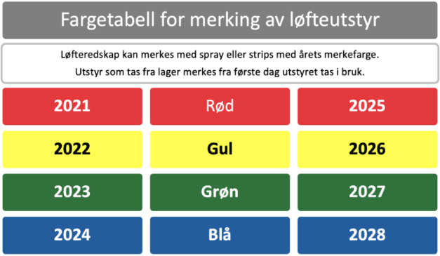 - Løfteutstyr skal være merket med oblat eller årets farge for å synliggjøre at årskontroll er gjennomført. Merkingen skal være godt synlig og varig.