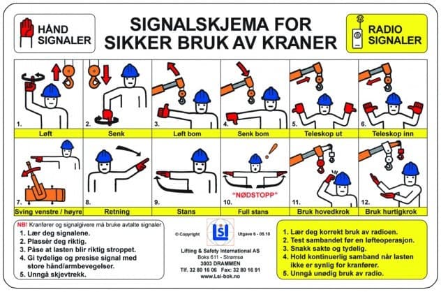- Kommunikasjonsform skal avtales før man starter arbeidet. Hånd- og radiosignaler er angitt nederst i denne instruksen