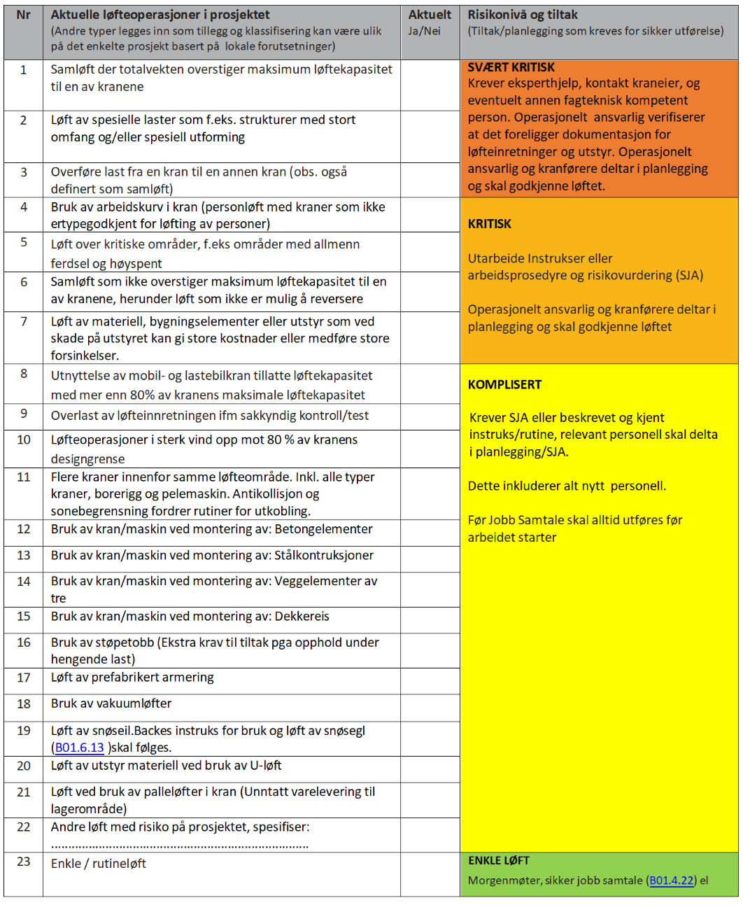 Sjekkliste for gjennomgang av ulike typer løft. Definer risikonivå og tiltak som skal være førende for planlegging av ulike typer løft. Gjøres kjent for alle som involveres i løfteoperasjoner på prosjektet og dokumenteres i prosjektets HMS- risikovurdering.